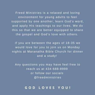 Any questions' you may have feel free to reach us @ 434-688-8999 of follow our socials @freedministries